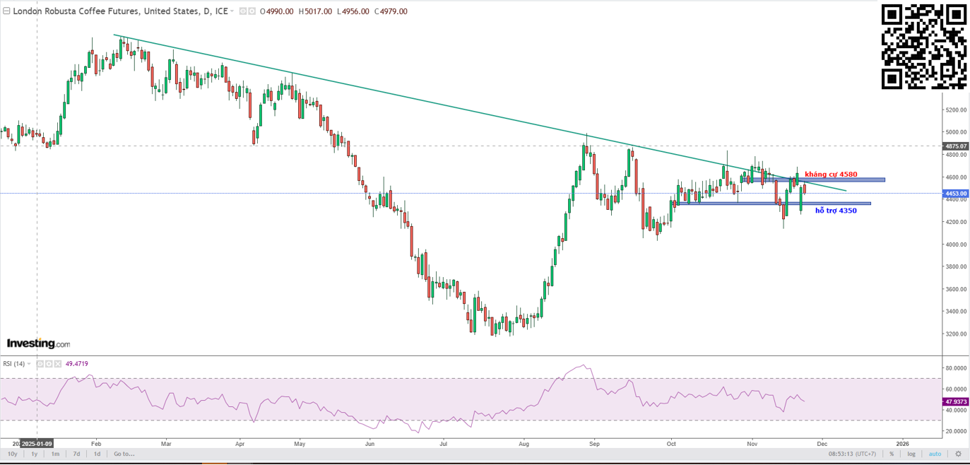 - RSI suy yếu và hướng xuống, dễ tiếp đà giảm phiên hôm nay. Giá khả năng cao tạo vùng đi ngang trong biên 4.350 - 4.580 $/tấn trong tuần.