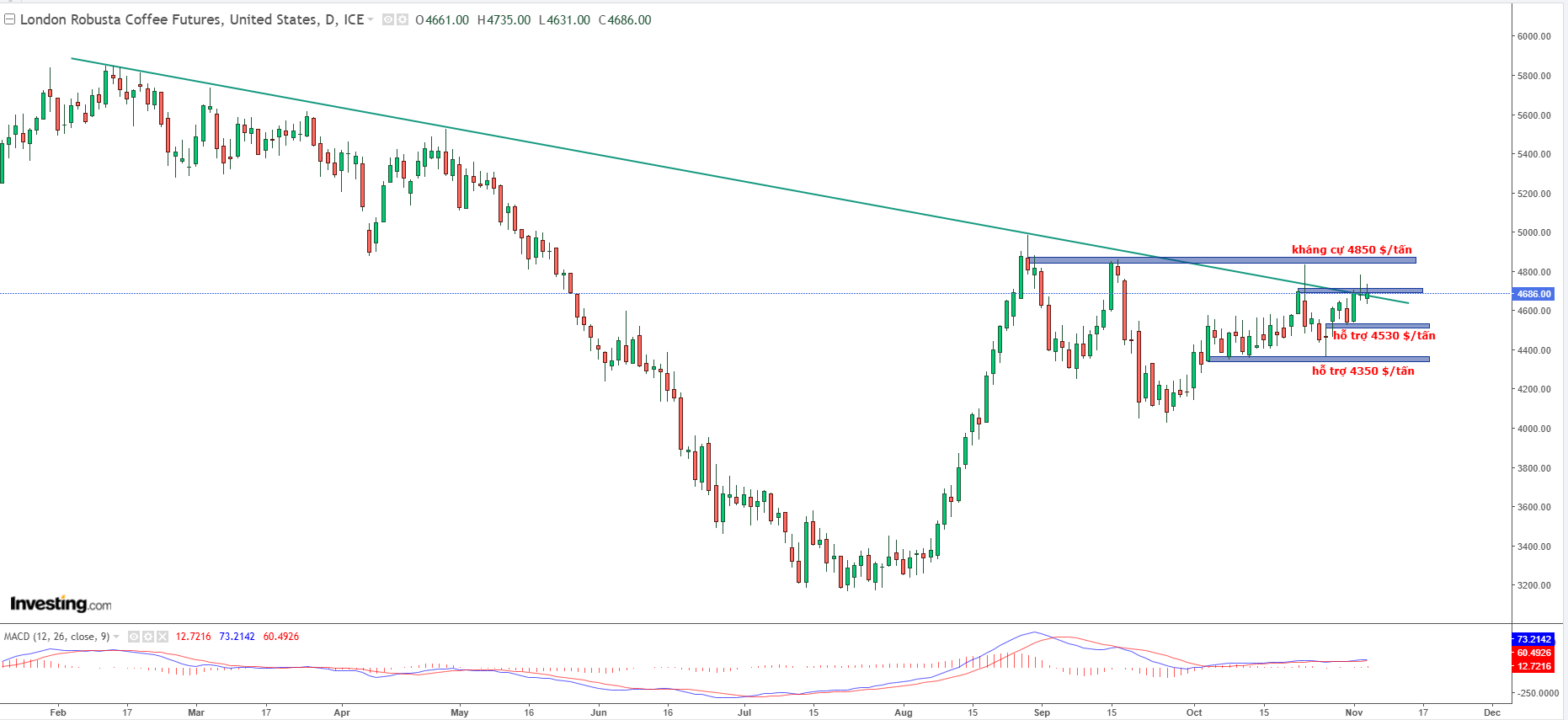 - Nhà đầu tư: ưu tiên xử lý lệnh bán đang còn (tất cả các lệnh khuyến nghị đều đang có lợi nhuận dự kiến). Có thể hạ kỳ vọng lợi nhuận khi cận kề bão đổ bộ vào VN. Nếu mở lệnh mới, khuyến nghị bán tại vùng kháng cự 4.800 $/tấn. Chốt lời 4.650 $/tấn, cắt lỗ 4.870 $/tấn.