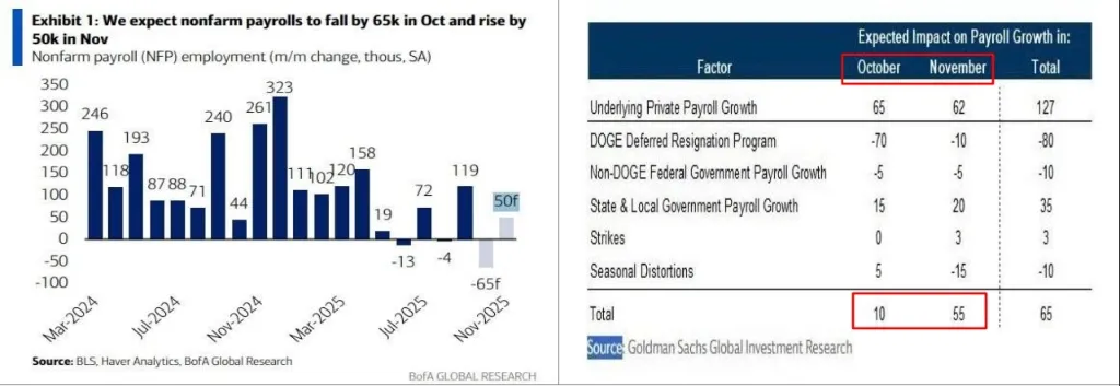 Hình: Dự báo từ Goldman Sachs và BofA cho thấy thị trường lao động tháng 11 dự kiến phục hồi nhẹ (+50K) sau đợt sụt giảm tháng 10. (Nguồn: Goldman Sachs Global Investment Research)