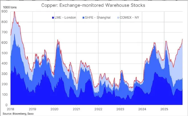 Hình: Tồn kho Đồng toàn cầu tăng mạnh trong năm 2024-2025. Đây là lý do chính khiến giá Đồng đang giằng co và chịu áp lực trong ngắn hạn. (Nguồn: Bloomberg, Saxo)