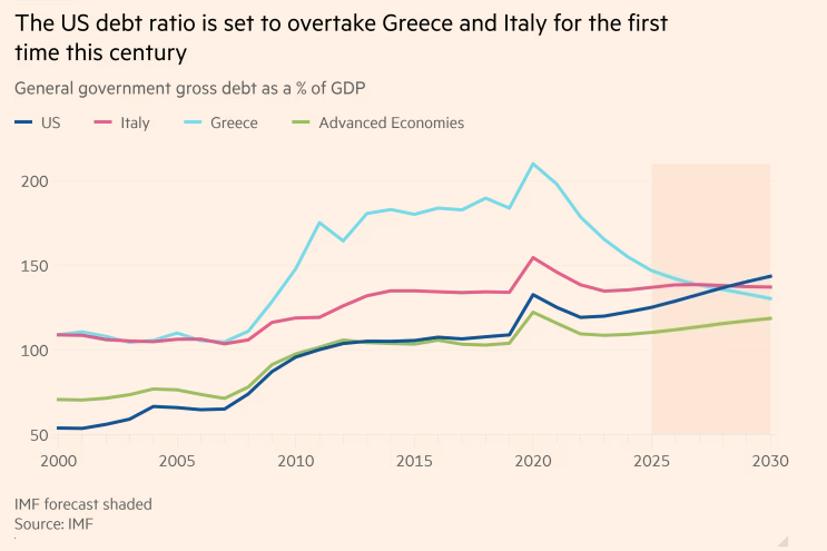 Theo dữ liệu mới nhất của Quỹ Tiền tệ Quốc tế (IMF), gánh nặng nợ công của chính phủ Hoa Kỳ đang trên đà vượt qua Ý – quốc gia vốn nổi tiếng với tình hình tài chính công mong manh – lần đầu tiên trong thế kỷ 21. Diễn biến này cho thấy tình hình tài khóa của Washington đang ở mức đáng báo động.