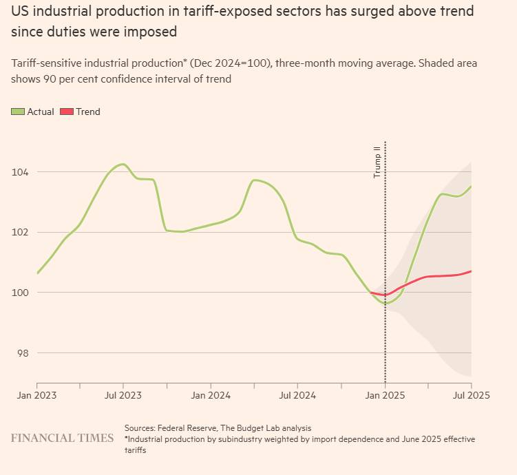 Dù thuế quan nhìn chung gây tổn hại cho nền kinh tế, một số lĩnh vực công nghiệp lại ghi nhận kết quả tích cực. Theo dữ liệu từ Yale Budget Lab, sản lượng công nghiệp trong các ngành chịu ảnh hưởng trực tiếp từ thuế quan đã tăng mạnh cho đến tháng 7. Giám đốc điều hành phòng thí nghiệm, bà Martha Gimbel, nhận định đà tăng này có thể một phần do yếu tố chu kỳ, song cũng cho thấy các doanh nghiệp sản xuất đang có phản ứng thích ứng rõ rệt. Một khảo sát của West Monroe cho thấy hơn một phần ba doanh nghiệp Mỹ báo cáo tác động tích cực từ thuế quan.