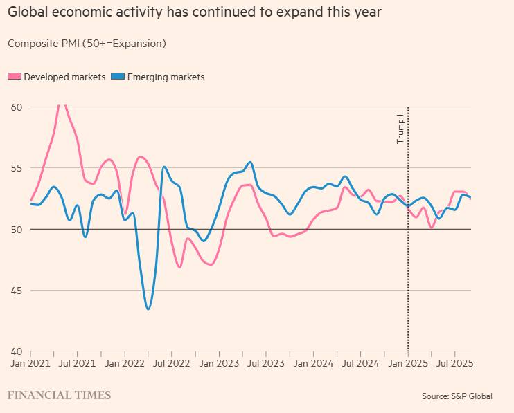 Các chính sách bảo hộ thương mại cùng những chỉ trích nhằm vào Cục Dự trữ Liên bang đã khiến đồng USD suy yếu đáng kể. Theo Dominic White của Absolute Strategy Research, “một đồng USD yếu thường là tin tốt cho tăng trưởng toàn cầu, đặc biệt với các nền kinh tế mới nổi.” Đồng bạc xanh giảm giá giúp cải thiện bảng cân đối của các doanh nghiệp vay nợ bằng USD, cải thiện điều kiện thương mại và phần nào lý giải cho sức bật bất ngờ của hoạt động kinh tế và thương mại toàn cầu trong năm nay.
