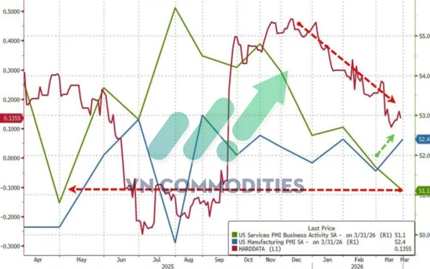 Dữ liệu sơ bộ công bố trong tháng 3 cho thấy chỉ số PMI tổng hợp của Mỹ do S&P Global khảo sát giảm xuống còn 51.4 điểm, thấp nhất trong 11 tháng, phản ánh đà tăng trưởng chung của khu vực tư nhân đang yếu đi.