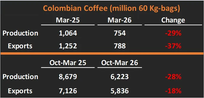 Sản lượng và xuất khẩu cà phê Colombia giảm mạnh theo số liệu từ Liên đoàn những người trồng cà phê Colombia. Trong tháng 3/2026, sản lượng chỉ đạt 754 nghìn bao loại 60 kg, giảm 29% so với cùng kỳ năm trước, còn xuất khẩu giảm 37% xuống 788 nghìn bao. Tính trong 6 tháng từ tháng 10 đến tháng 3, sản lượng giảm 28% còn 6,223 triệu bao, trong khi xuất khẩu giảm 18% xuống 5,836 triệu bao.