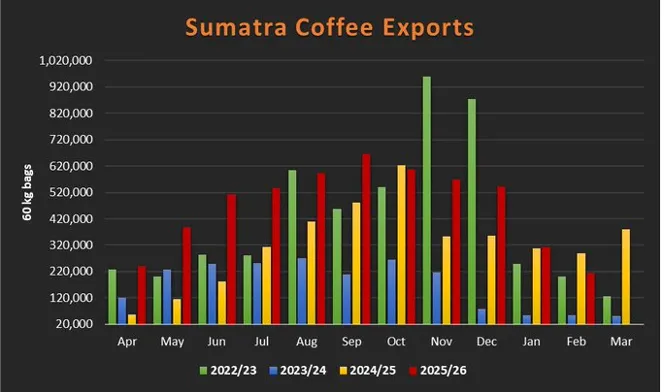 Xuất khẩu cà phê Indonesia trong tháng 2/2026 đạt 215.350 bao loại 60 kg, giảm 25% so với cùng kỳ năm trước và giảm 31% so với tháng 1/2025. Tuy vậy, lũy kế niên vụ từ tháng 4 đến tháng 2 vẫn đạt khoảng 5,2 triệu bao, tăng 49% so với cùng kỳ.