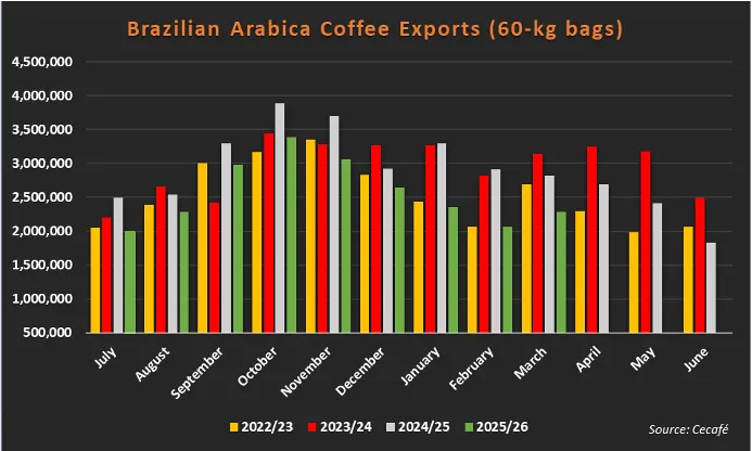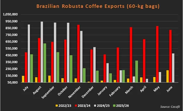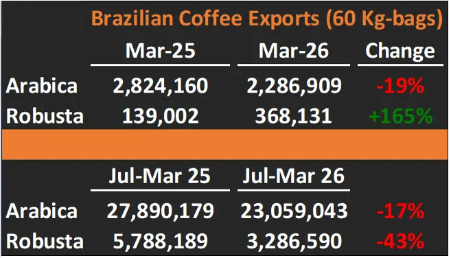 Xuất khẩu cà phê Brazil trong tháng 3/2026 : Arabica chỉ đạt 2,287 triệu bao, giảm 19% so với cùng kỳ năm trước, trong khi robusta đạt 368 nghìn bao, tăng mạnh 165%. Tuy nhiên nếu nhìn lũy kế từ tháng 7 đến tháng 3, cả hai dòng đều vẫn thấp hơn năm trước, khi arabica giảm 17% còn robusta giảm tới 43%.