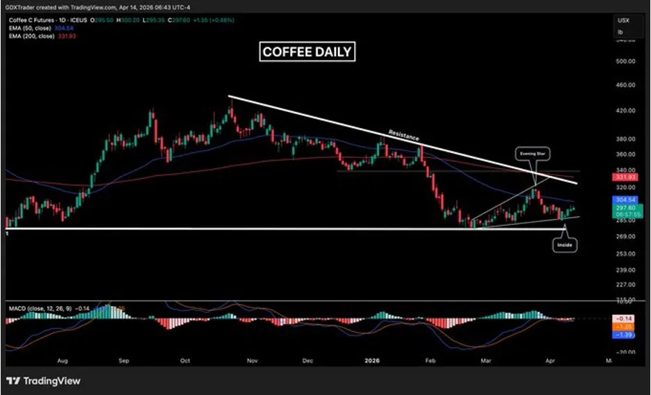 Giá cà phê đang cố gắng tạo điểm đảo chiều sau nhịp hồi phục từ vùng hỗ trợ tăng vào cuối tuần trước. Tín hiệu xác nhận đến từ việc giá đóng cửa vượt lên trên biên của cây nến mẹ, sau khi trước đó xuất hiện mẫu hình nến trong. Dù vậy, đà tăng trong hai phiên gần đây vẫn chưa thật sự thuyết phục, vì bóng nến trên còn khá nhỏ và cho thấy bên mua vẫn chưa lấy lại được thế chủ động rõ ràng. Về tâm lý thị trường, điều này phản ánh lực mua bắt đáy đã xuất hiện nhưng chưa đủ mạnh, trong khi bên bán vẫn còn hiện diện mỗi khi giá hồi lên. Quan trọng hơn, giá vẫn đang nằm trong xu hướng giảm lớn, vẫn dưới các đường trung bình quan trọng và còn vận động trong vùng tích lũy nghiêng giảm. Vì vậy, tín hiệu đảo chiều hiện tại vẫn khá mong manh và cần thêm xác nhận, nếu thất bại thì giá vẫn có nguy cơ quay lại xu hướng giảm trước đó.