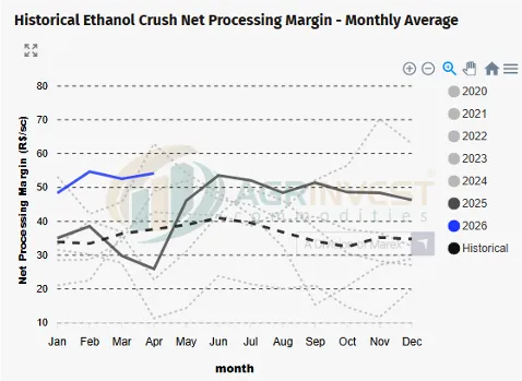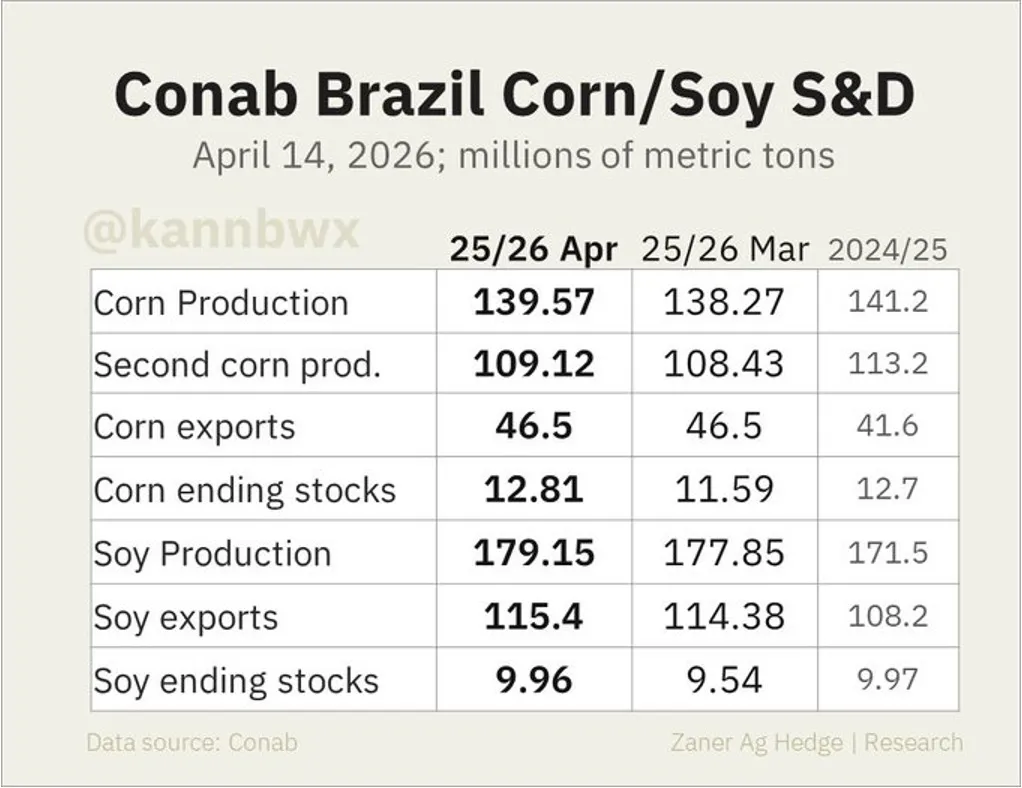Nhiều về khả năng Brazil nâng tỷ lệ pha trộn ethanol lên E32, điều này có thể làm tăng thêm khoảng 520 triệu lít nhu cầu ethanol trong giai đoạn từ tháng 5 đến tháng 12. Trong khi đó, biên lợi nhuận sản xuất ethanol từ ngô tại bang Mato Grosso vẫn ở mức rất tốt, nhờ giá ngô nội địa thấp, chi phí thay thế tăng và nhu cầu FOB Santos tăng khoảng 20 cent mỗi giạ trong tuần qua, cùng với nhu cầu nội địa ổn định và đồng real Brazil mạnh lên.