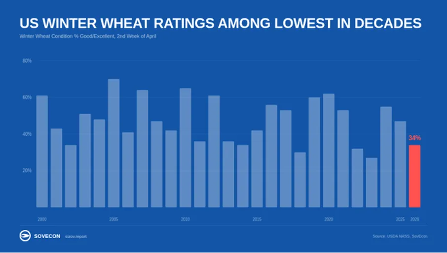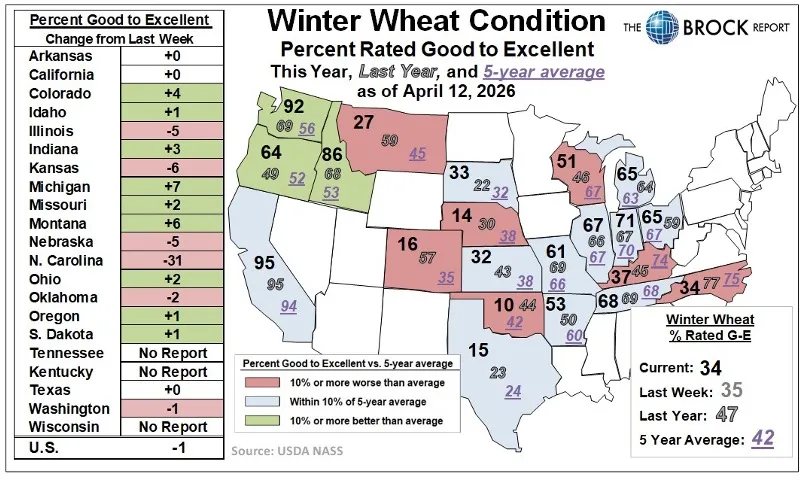 Chất lượng lúa mì vụ đông của Mỹ tiếp tục suy yếu trong tuần này, với tỷ lệ tốt - xuất sắc trên toàn quốc giảm thêm 1 điểm phần trăm so với tuần trước. Đáng chú ý, Bắc Carolina giảm rất mạnh tới 31 điểm. Nhiều bang trồng lúa mì trọng điểm như Montana, Nebraska, Oklahoma, Kansas, Kentucky và Bắc Carolina hiện đều đang thấp hơn mức trung bình nhiều năm trên 10 điểm.