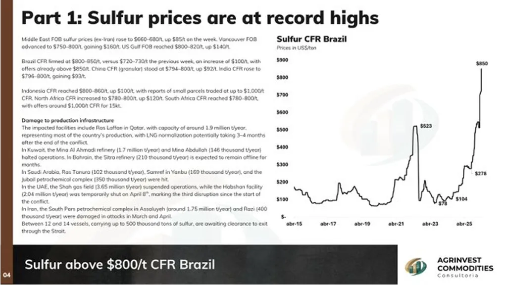 Giá phosphate vẫn chưa có dấu hiệu hạ nhiệt, chủ yếu do giá lưu huỳnh tiếp tục tăng rất mạnh. Tại Brazil, giá lưu huỳnh CFR đã lên mức cao kỷ lục.