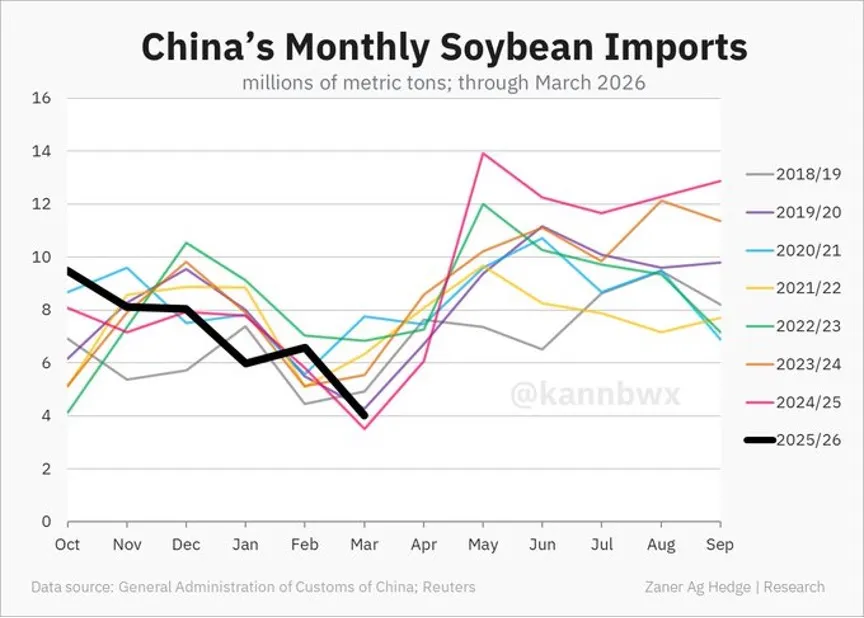 Trung Quốc nhập khẩu đậu tương trong tháng 3 chỉ đạt 4,02 triệu tấn, thấp hơn khá nhiều so với kỳ vọng và cũng thấp hơn mức bình quân thông thường của tháng này. Dù vậy, tính từ đầu niên vụ 2025–2026 đến nay, tổng lượng nhập khẩu vẫn đang ở mức cao nhất trong 3 năm, nhưng vẫn thấp hơn trung bình 5 năm do lượng hàng từ Mỹ về còn hạn chế. Thị trường hiện kỳ vọng nhập khẩu của Trung Quốc sẽ tăng mạnh trở lại trong giai đoạn tháng 4 đến tháng 6, với khối lượng hơn 10 triệu tấn mỗi tháng.