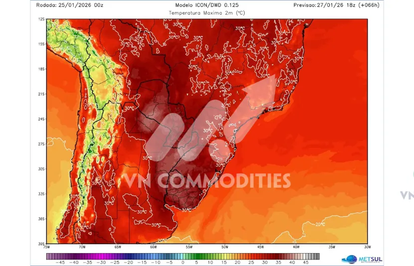 10. Nắng nóng sẽ quay trở lại Nam Mỹ,sau một tuần thời tiết dễ chịu, đang gia tăng cường độ và có thể vượt ngưỡng 40°C. Tập trung ở miền Nam và Đông Nam Brazil, miền Bắc – Trung Argentina, cùng Uruguay và Paraguay. Nhiều khu vực trong vành đai nông nghiệp được dự báo có nhiệt độ vượt 30°C, thậm chí tiệm cận hoặc vượt 40°C.