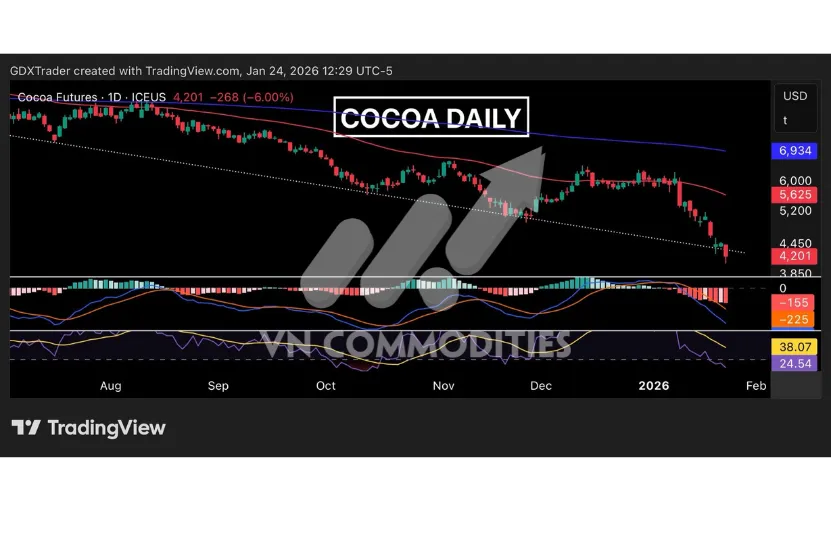 1. Giữa tuần trước, giá ca cao bắt đầu có dấu hiệu chững lại. Trong phiên thứ Tư, cây nến spinning top xuất hiện ngay tại vùng hỗ trợ của xu hướng giảm, khi thị trường đang ở trạng thái quá bán. Điều này cho thấy lực bán đã yếu đi, đồng thời bắt đầu xuất hiện lực mua thăm dò ở vùng giá thấp. Sang phiên thứ Năm, thị trường hình thành một cây nến nằm gọn trong biên độ của phiên trước, phản ánh tâm lý thận trọng và cho thấy giá đang tạm thời tích lũy, chờ tín hiệu rõ ràng hơn cho bước đi tiếp theo. Tuy nhiên sang phiên thứ Sáu giá ca cao tiếp tục chịu áp lực bán mạnh và tạo một cây nến giảm dài, đóng cửa gần mức thấp nhất phiên. Điều này cho thấy bên bán vẫn đang kiểm soát thị trường, và nỗ lực ổn định xuất hiện trước đó trong tuần đã không được xác nhận. Ở thời điểm hiện tại, thị trường vẫn chưa xuất hiện tín hiệu đảo chiều đáng tin cậy.
