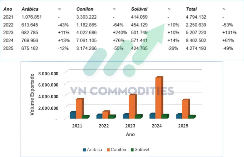 2. Năm 2025, xuất khẩu cà phê của bang Espírito Santo giảm mạnh 49% so với năm 2024, chủ yếu do sức cạnh tranh giá của Robusta suy yếu, hạn chế logistics với Arabica và tác động từ thuế nhập khẩu của Mỹ. Tuy nhiên, giá cà phê quốc tế tăng cao đã giúp bù đắp đáng kể sự sụt giảm về khối lượng, đưa doanh thu ngoại hối của bang đạt 1,2 tỷ USD, tương đương 67% mức kỷ lục của năm 2024. Giá xuất khẩu bình quân đạt 291 USD/bao, tăng 35% so với năm 2024 và 84% so với năm 2023, qua đó tiếp tục hỗ trợ nguồn thu dù xuất khẩu giảm sâu.