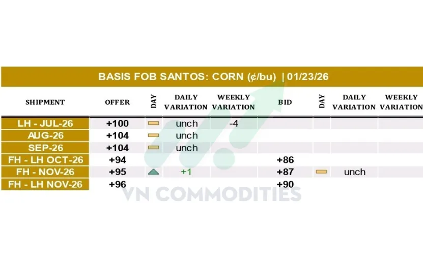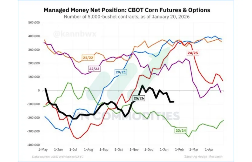 2. Tính đến hết ngày 20/1, giá ngô CBOT tăng nhẹ nhưng dòng tiền đầu cơ gần như không thay đổi, khi các quỹ vẫn duy trì trạng thái bán ròng với mức điều chỉnh rất nhỏ. Điều này cho thấy đà tăng hiện tại chưa đủ thuyết phục để kích hoạt sự đảo chiều vị thế. Trong thời gian tới, thị trường sẽ tập trung vào ba yếu tố chính: nhu cầu xuất khẩu của Mỹ, tiến độ gieo trồng tại Brazil và triển vọng vụ ngô Mỹ năm 2026, đây sẽ là các yếu tố quyết định liệu xu hướng giá có được củng cố hay không.
