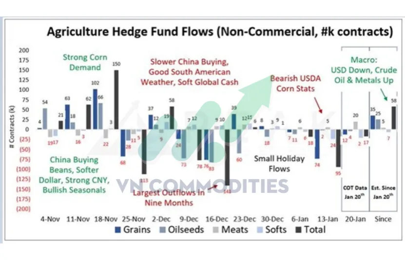 4. Dòng tiền của các quỹ phòng hộ đã quay lại thị trường nông sản. Dù trong tuần báo cáo COT các quỹ phi thương mại có bán ròng nhẹ, nhưng từ giữa đến cuối tuần họ đã mua lại vị thế nhờ nhu cầu xuất khẩu Mỹ cải thiện và tâm lý vĩ mô tích cực.