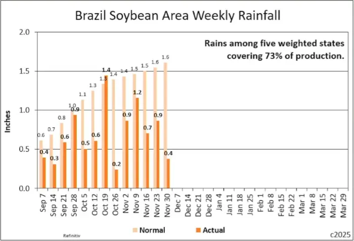 • Cung Gặp Khó (Brazil): Tại Nam Mỹ, rủi ro thời tiết đang tăng lên. Dữ liệu lượng mưa tại các vùng trồng trọng điểm của Brazil liên tục thấp hơn mức trung bình trong 3 tuần gần nhất. Giai đoạn tháng 12 là lúc cây làm hạt, cực kỳ nhạy cảm với khô hạn => Đây là yếu tố muốn đẩy giá TĂNG.