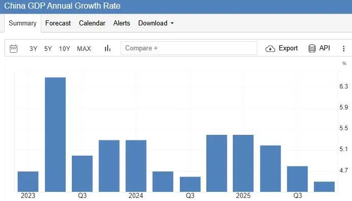 Hình: Biểu đồ Tốc độ tăng trưởng GDP hàng năm của Trung Quốc. Đà tăng trưởng đang có dấu hiệu chững lại rõ rệt ở quý gần nhất.