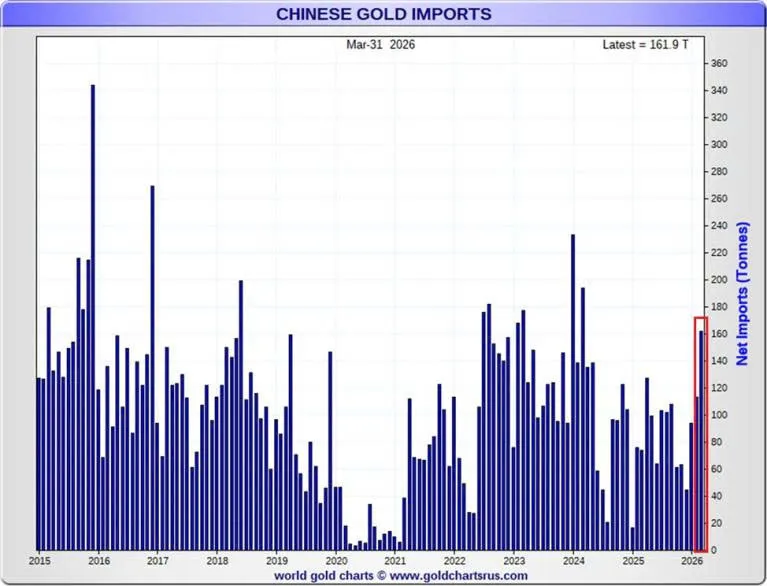 Song song với bạc, thị trường vàng cũng ghi nhận sự phục hồi mạnh mẽ về nhu cầu. Trong tháng 3/2026, Trung Quốc nhập khẩu khoảng 162 tấn vàng, mức cao nhất kể từ tháng 3/2024.