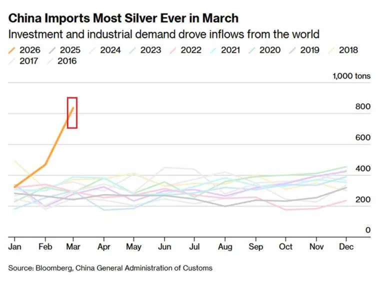 Nhu cầu bạc tại Trung Quốc đang tăng trưởng mạnh mẽ, thể hiện rõ qua số liệu nhập khẩu tháng 3/2026. Cụ thể, lượng bạc nhập khẩu đạt khoảng 836 tấn, tăng 78% so với tháng trước và cao hơn 173% so với mức trung bình 10 năm (~306 tấn). Đây là mức cao nhất từng ghi nhận trong lịch sử.